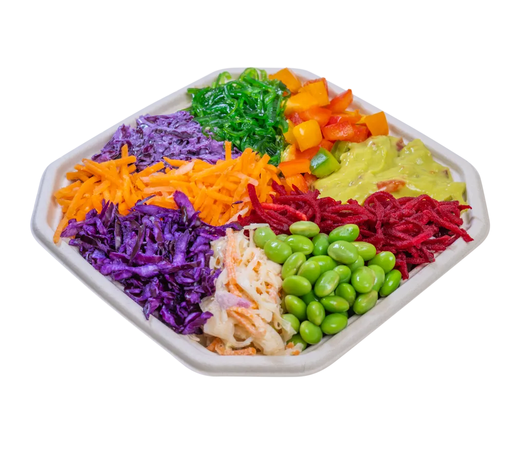 Hovädzie kúsky z flank steaku v medovo-dijón dressingu, jazmínová ryža , sójový bezl. dressing, červená kapusta mayo s kukuricou , wakame, mrkva s reďkovkou, jarná cibuľka, sriracha mayo dressing, 400g