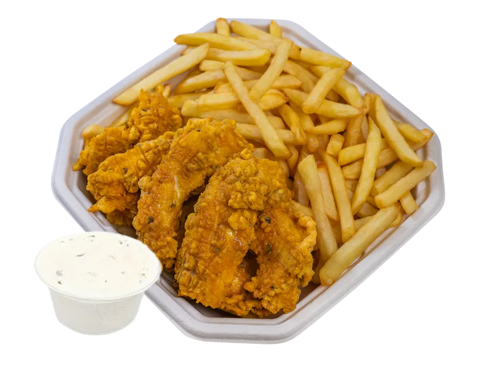 Kuracie stripsy v chipotle chilli omáčke, hranolky, koleslaw s fazuľou, pažítka 400g